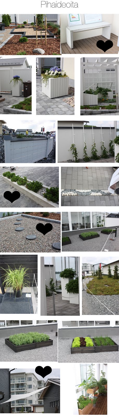 Olen nyt tämän illan väkertänyt teille kuvakollaaseja mieluisimmista jutuista, mitä bongasin messuilla. Keskityin lähinnä yksityiskohtiin, sisustuksiin sekä pihoihin. Merkkasin kollaaseihin erityissuosikit sydämellä. Tässäpä tulee melkoinen kuvapläjäys ja megapostaus (osa kuvista menee reunan yli, mutta ei voi mitään)…