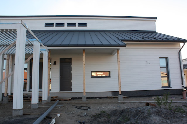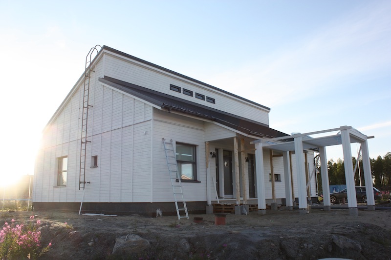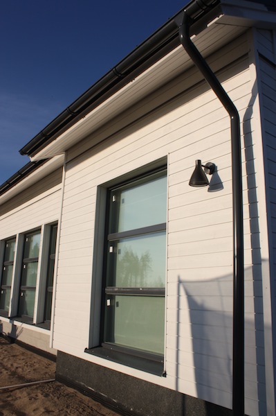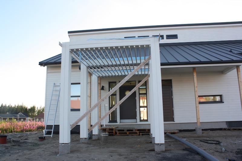 Talo ja saunarakennus on nyt maalattu ulkoapäin kertaalleen! Huh huh! Täytyy varmaan maalata vielä toisen kerran, mutta ei tänä vuonna. Talon päätyihin tuli Harmaja-koristerimoitus. Aluksi mietimme, että laitetaanko niitä rimoituksia ollenkaan, mutta nyt kun ne ovat paikallaan, niin olemme tyytyväisiä, että laitettiin. Ne viimeistelevät julkisivun.
