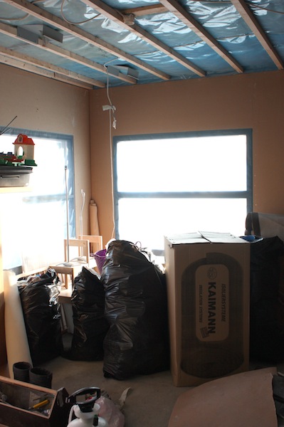 Mutta suunnitelmat ovat valmiina. Lattia jätetään betonille ja se käsitellään jollain (ei maalata). Sisäkatto tehdään puupanelista, joka maalataan valkoiseksi. Haaveissa oli, että takaseinämä olisi paneloitu vaakapuupaneelilla, mutta taitaa tulla liikaa paneelia jos kattokin on sitä. Kipsilevykattoa ei jakseta alkaa tuonne hinkkaamaan (siinä oli talossa niin iso homma). Tavoitteena on kuitenkin, että oleskelutila olisi vähän loft-henkinen. EDIT: Mankku tuossa kommentoi, että kyllä hän voi sen kipsilevykaton tehdä sittenkin. Sanoo kaipaavansa pakkelointihommia. ;-D
