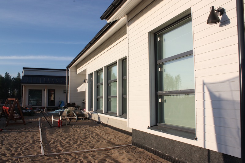 | Ovissa ikkunoiden ympärillä olevat puunsävyiset kehykset täytyy vielä maalata saman värisiksi kuin ovi |