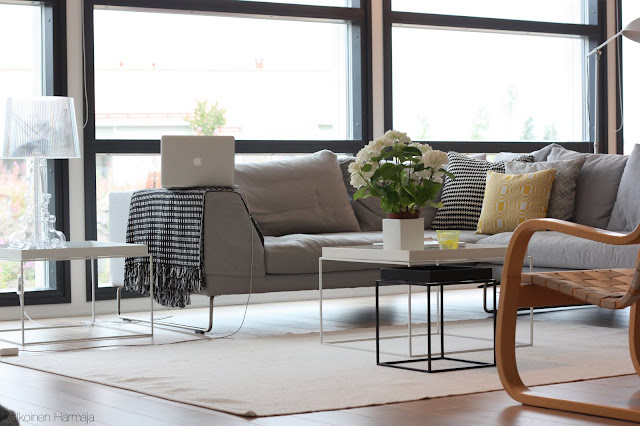 >En olekaan aiemmin tainnut kehua, mutta nyt niin teen: tuo teidän sohva on itse täydellisyys! Kauniin vaalea, muttei kuitenkaan valkoinen. Näyttää pehmeältä mutta jämäkältä. Sirot metallijalat tuo kauniin keveän ilmeen koko sohvaan. Ja plussaa isosta koosta! IHANA! P.s. Ostatko siis viikottain leikkokukkia kotiin vai ihan tällaisia pidempiaikaisiakin? Tuollainen kimppu viikossa -tapa taitaa kotiutua tännekin kun olen nyt itsekin kotiutunut periferia-reissuiltani.:)