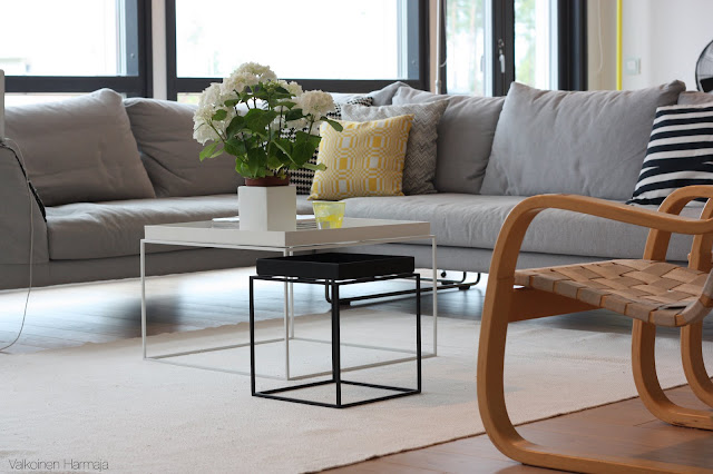 >Keltainen on tosi kiva pieninä annoksina, minulla oli keltainen-vaihe keväällä. Nyt on meneillään lila-vaihe, sellainen kaunis syreeninlila.Kauniilta näyttää teidän olohuoneessa, nuo sohvapöydät ovat tosi kauniita, niin siroja.