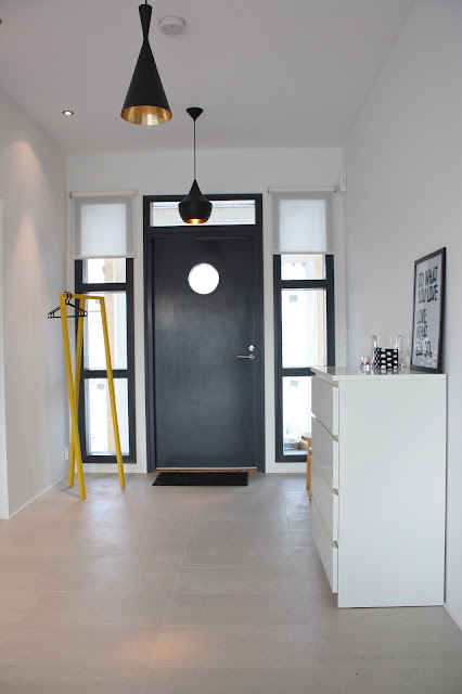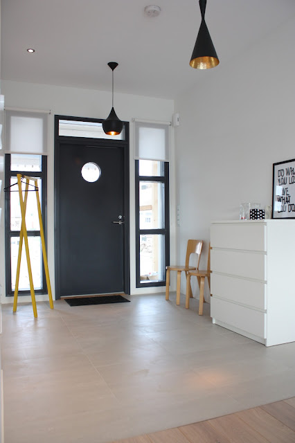 Ihanaa, kun nyt on siisti eteinen! Sisustus näyttää vielä vähän tyhjältä ja viimeistelemättömältä. Täytyisi saada jokin kasvi tuohon lipaston päälle ja peili seinään. Alunperin olimme suunnitelleet, että laitetaan peili kiinni liukuoveen, mutta koska siitä tuli mielestäni niin kaunis, en enää raaskisikaan laittaa peiliä oveen kiinni. Niinpä peilin paikka on liukuoven vasemmalla puolella. Täytyykin tilata eteisen peili samalla, kun kylppärin peilit laitetaan tilaukseen. Uusi (vanha)lipasto on edelleen haaveissa myös (kuten täällä kirjoittelin), mutta saa tuo vanha Ikean Malm kelvata nyt jonkin aikaa.