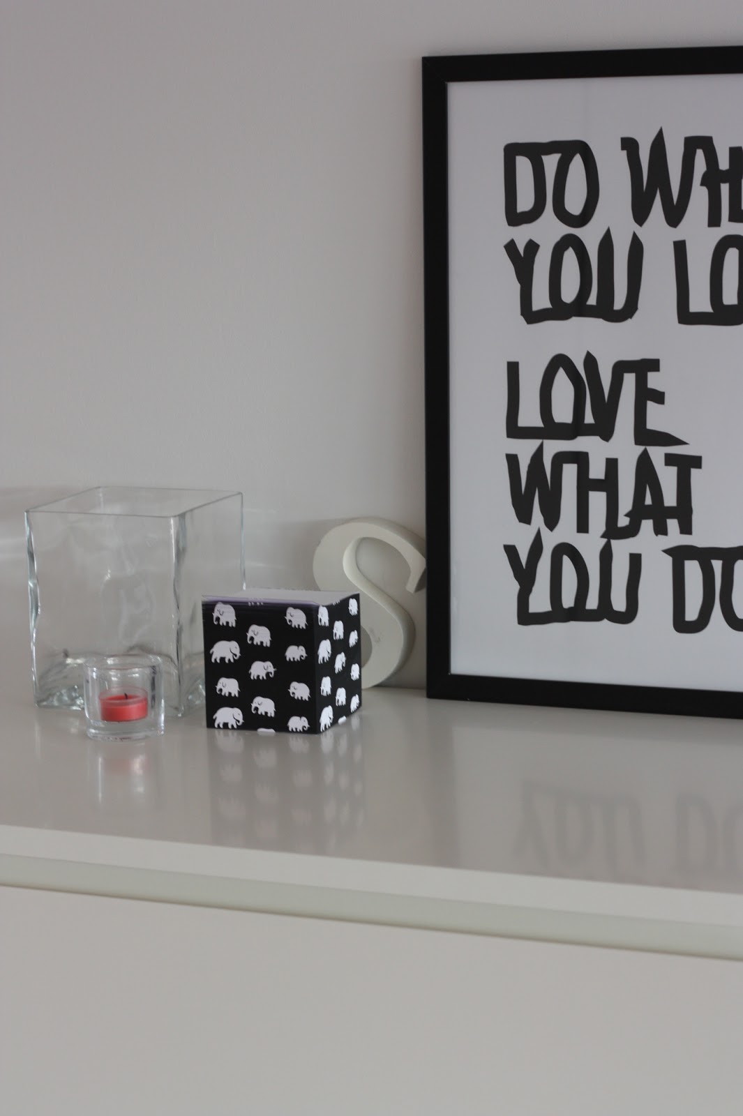 | Eteisen lipaston päällä on siskolta saatu Therese Sennerholtin printtityö sekä Svenskt Tennin muistilappuja |