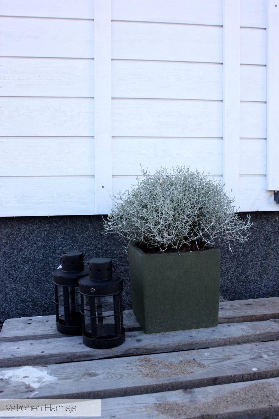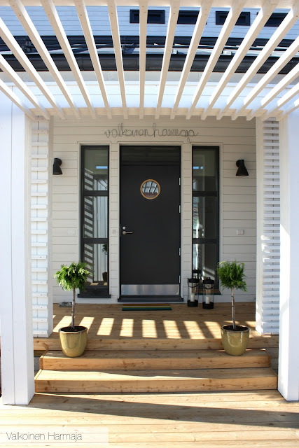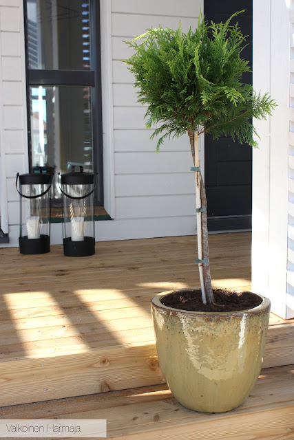 >Voi huokaus, miten kaunis teidän pääsisäänkäynti on -ei voi kuin ihastella! Ja voin vain kuvitella, miten kaunis teidän koko piha ja terassi sitten ovat, kun olette saaneet sen laitettua valmiiksi. Nuo ulkovalaisimet on myös tosi kauniit ja sopii hyvin talon tyyliin.Mun mielestä noissa tuijien ruukuissa ei ole mitään vikaa. Päinvastoin tuovat juuri mainitsemaasi kontrastia ja myös ehkä tietynlaista rouheutta, mikä ulkomaisemaan sopiikin. Itsekin varmaan maalaisin tuon vihreän ruukun mustaksi, pääsee kasvikin paremmin oikeuksiinsa.Mukavaa viikonloppua!-I-