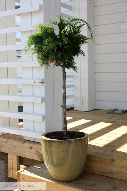 Pääsisäänkäynnin eteen ostin kaksi puun muotoista tuijaa sekä niille sopivat ruukut. Olin katsellut noita ruukkuja jo aiemmin Kodin Terrassa, mutta nyt ne olivat alennuksessa: vain 5 €/kpl, joten ei tarvinut kauaa miettiä mitkä ruukut valitsen. Minusta nämä ovat kauniit ruukut ja tuovat jälleen kerran sitä niin usein mainitsemaani kontrastia moderniin tyyliimme. Valtaosan mielestä ne ovat varmaankin rumat, kun eivät ole menneet kaupaksi. 😉