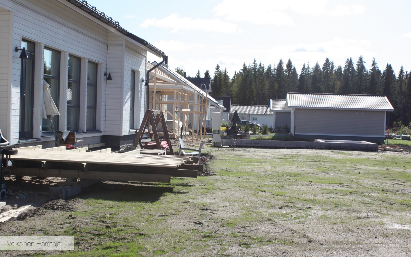 Ja kuten kuvasta näkyy, on takaterassiakin jo pikkuisen tehty. Nyt Mankku kylläkin häärää saunarakennuksen kimpussa, sillä hänellä on jo kova hinku päästä saunomaan. Itse sauna ja kylppäri ovatkin siellä jo lähes valmiita (saunan lasit vain puuttuvat), mutta oleskeluhuone on vielä vaiheessa. Kirjoittelen siitä omassa postauksessa jossain vaiheessa…