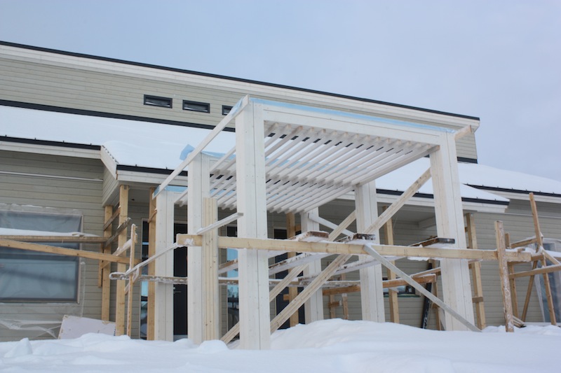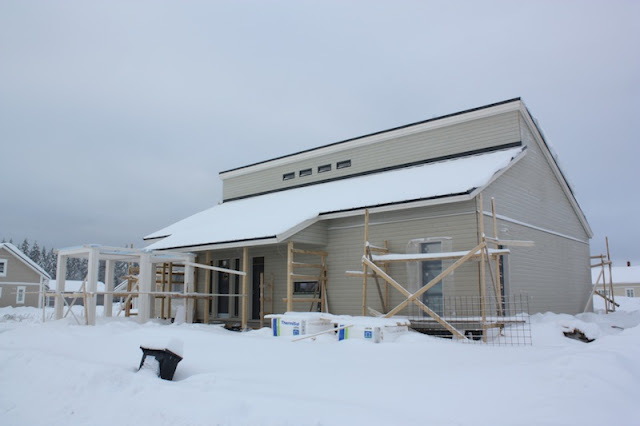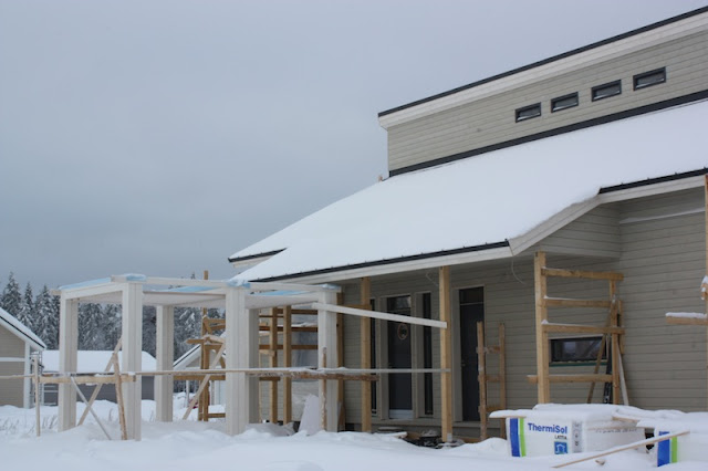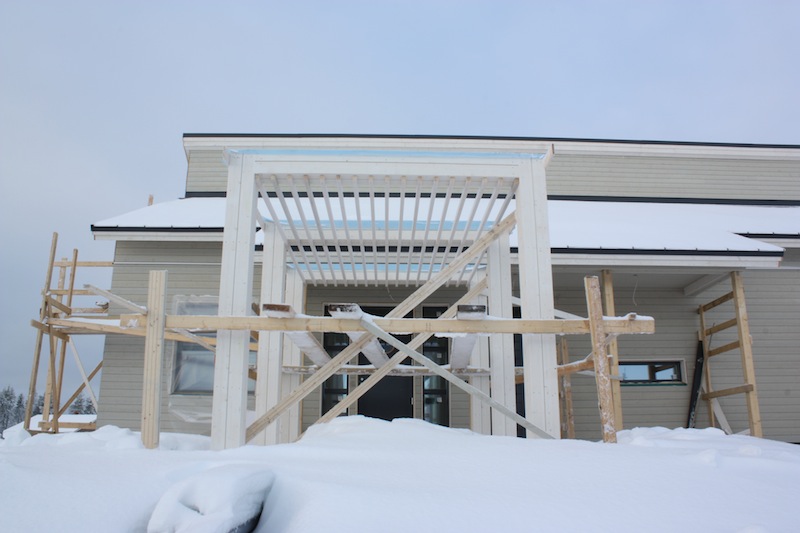 Viikolla kolme tapahtui huomattava ja meille tärkeä päivitys talon julkisivussa: timpurit asensivat Harmaja-koristeportin ulko-oven eteen. Juuri tuo koristeportti on yksi syy miksi alunperin ihastuimme Harmaja-mallistoon; se viimeistelee kauniisti koko talon julkisivun. Tykätään siis siitä kovasti! Kuvia vähän joka suunnasta: