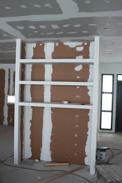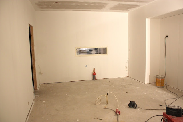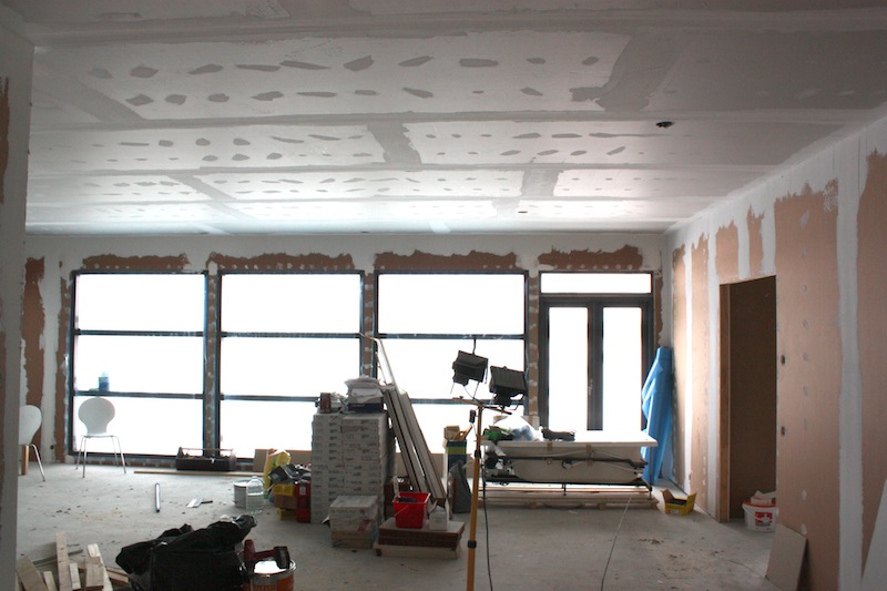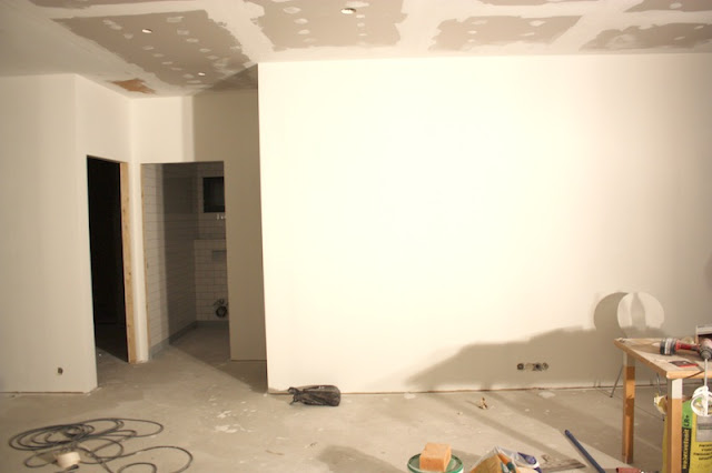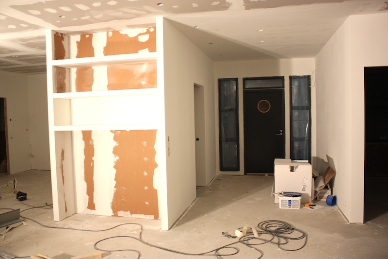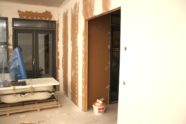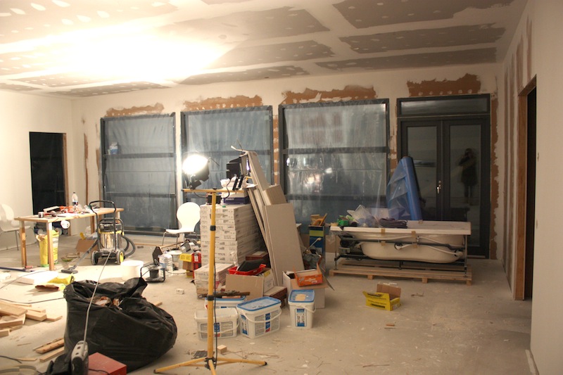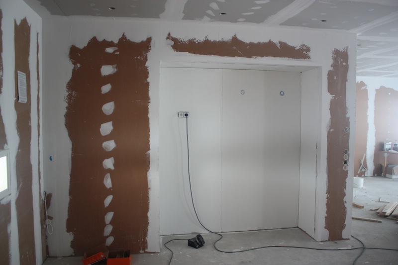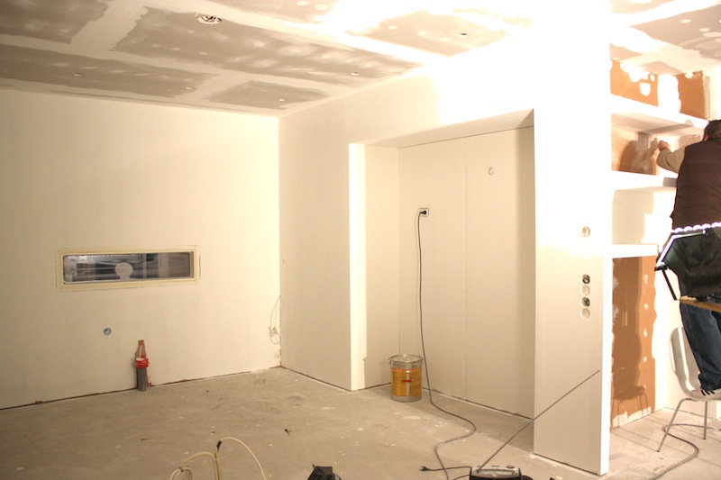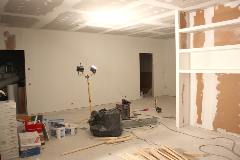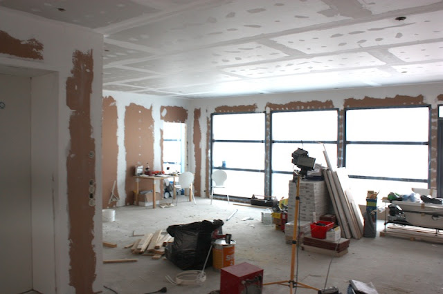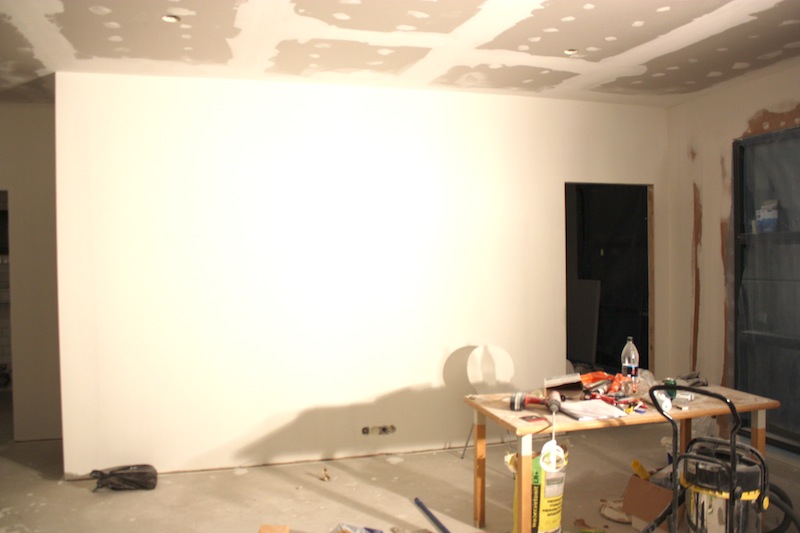 Sisällä jatkuivat paklaus- ja pohjamaalaustyöt. Magnus on ahkeroinut talon suurimman tilan kimpussa, eli olohuone-keittiö-ruokailutila-akselilla, joka on yhteensä 66m2 (koko pohjapiirroksen näet täältä). Ja on edistynyt todella hyvin!