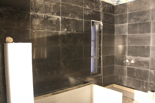 Myös tämä Laattapisteen KCZ Pure Black -mosaiikki on kiveä, jossa vaihtelevat harmaan eri sävyt. Tummin sävy on lähes sama kuin isojen laattojen sävy, vaikka yllä olevassa kuvassa sävyero näyttääkin todella suurelta. Kun näin tuon mosaiikin, tiesin heti, että se oli juuri se mitä olimme etsineet! Eli nyt on sitten saunarakennuksenkin kylpyhuoneen laatat hankittu. Itse asiassa, seinät on jo laatoitettu (meillä on hyvin tehokas timpuritiimi). Tässä yksi ”sneak peek” -kuva, vaikka tämä kuuluisikin oikeasti viikon 6 raksapostaukseen: