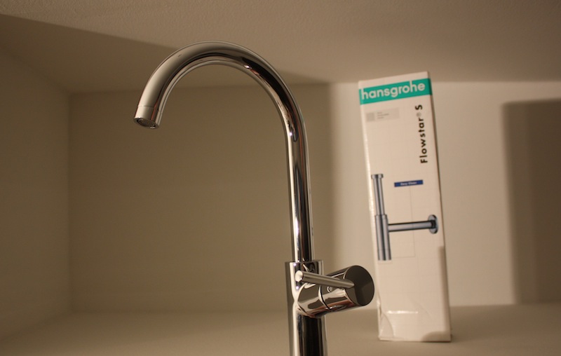 | Kodinhoitohuoneen altaan Talis-hana ja takana tyylikäs kierrevesilukko (joka jää näkyviin altaan alle) |