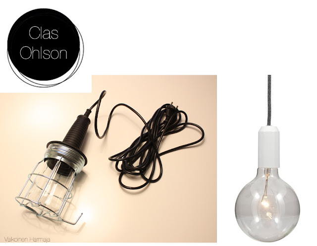 Erilaiset teollisuusvalaisimet ovat nyt kovassa huudossa ja niitä näkee monessa paikassa. Meidän sähkömies luuli aluksi, että laskimme leikkiä, kun kerroimme, että eteisen vaatehuoneeseen tulee kaksi Clas Ohlsonilta hankkimaamme työmaavalaisinta (”kehikkovalaisimet” ylähäällä vasemmalla). Mutta kyllä semmoiset on sinne tulossa. Niiden lisäksi ostimme viisi kappaletta kollaasin oikealla puolella näkyviä ”pallovalaisimia”. Ne laitetaan yhdeksi rykelmäksi työhuoneen kattoon.