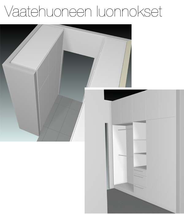 Raksalla mennään eteenpäin askel askeleelta, mutta olen ajatellut välissä kirjoitella myös sisustusjuttuja ja mahdollisesti myös inspiraatiopostauksia. Tämä postaus on sekoitus vähän kaikkea sitä. Ajattelin nimittäin seuraavaksi kertoa teille millainen vaatehuone (ts. walk-in-closet) meille tulee päämakuuhuoneen yhteyteen.
