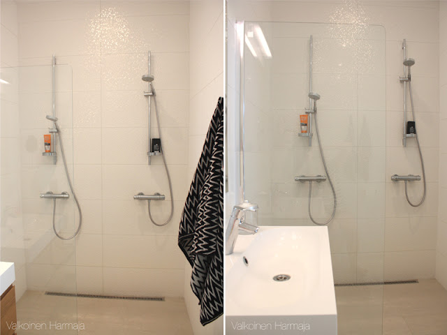 Kerrataan vielä, että kylpyhuoneemme laatat ovat Laattapisteestä: lattiassa Ii Micron 36G, seinissä Marmi Blanco ja suihkujen takaisessa seinässä Cubica Blanco. Allaskaappi-lavuaariyhdistelmä on Ikean Godmorgon-sarjaa. Lasinen suihkuseinä on myös hankittu Laattapisteestä, mutta en nyt valitettavasti muista mikä valmistaja oli.