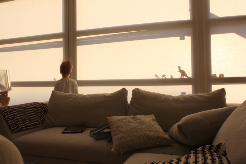 Nyt vajaa viikon asumisen jälkeen olemme todella tajunneet, kuinka valoisa tämä asunto on. Täällä on aivan mielettömän kirkasta! Siinä mielessäkin on hyvä saada verhot heti ikkunaan, sillä aurinko lämmittää kovasti asuntoa. Poikamme keksi kivan leikin uusien verhojen myötä ilta-auringon paisteessa: