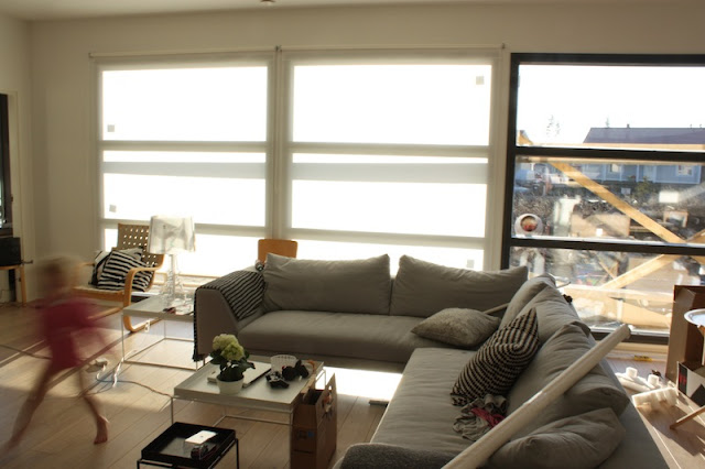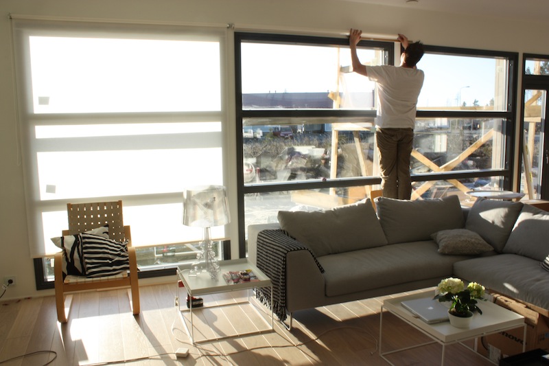 Parina ensimmäisenä iltana tuntui hassulta mennä nukkumaan, sillä makkarin ikkuna on sängyn vieressä ja yltää lattiaan asti, eikä meillä ollut heti verhot paikoillaan. Tuntui siltä kuin olisi nukkunut näyteikkunassa. Niinpä verhot asennettiin ekana makkareihin – lapsetkin nukkuivat heti pidempään. Tänään asensimme ne myös muihin ikkunoihin.